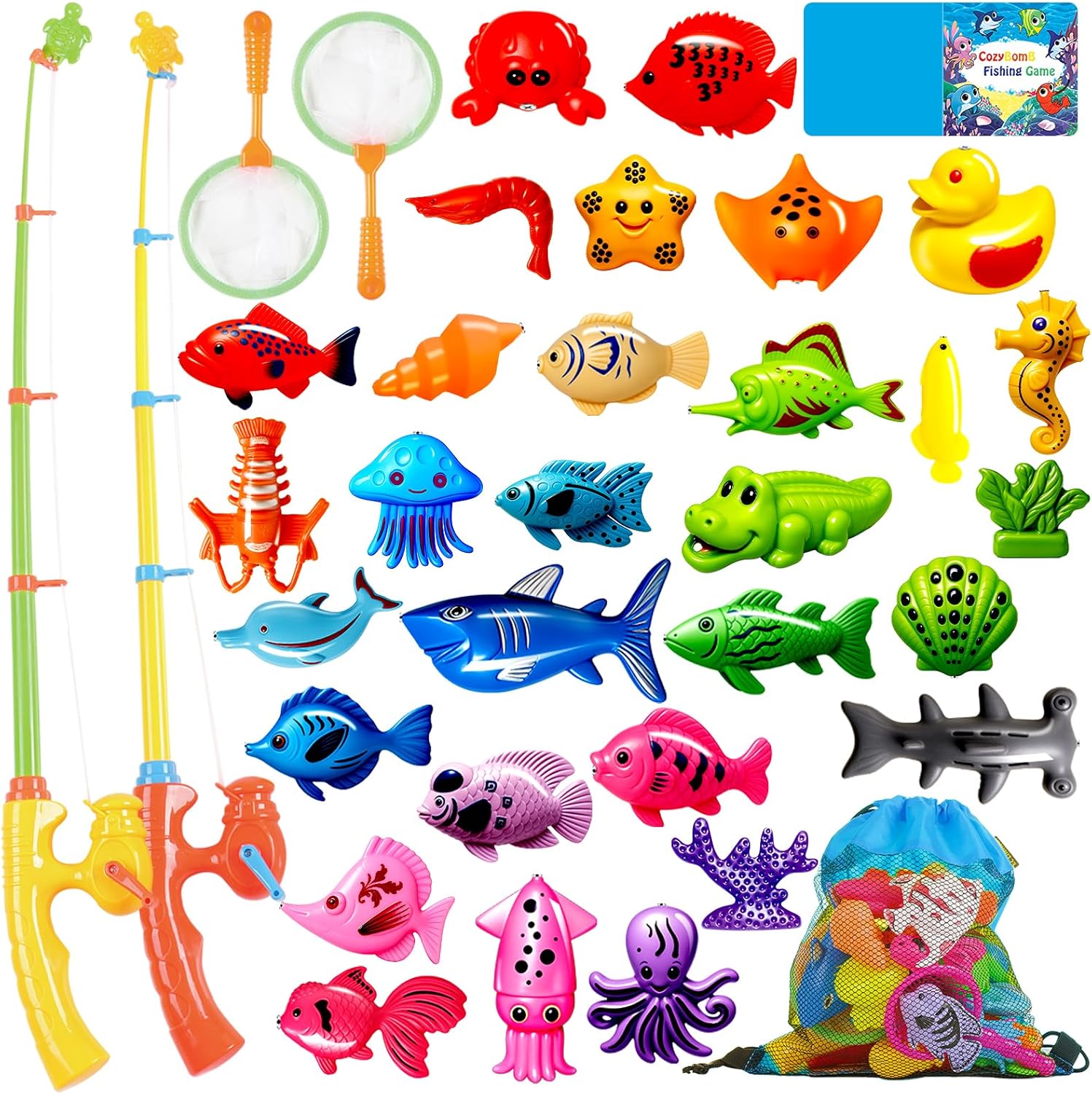 CozyBomB™ Magnetic Fishing Toys Game Set for Kids | Water Table Bathtub Kiddie Pool Party & Pole Rod Net, Plastic Floating Fish Toddler Color Ocean Sea Animals Birthday Age 3 4 5 6 Year