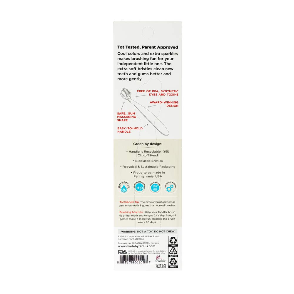 RADIUS Toddler Toothbrush & Toothpaste Bundle for Kids, 2 Pack Totz Plus Silky Soft Brush in White/Coral & Cool Grey/Amethyst Purple and 1 Count Dragon Fruit Toothpaste, for Children 18 Months & Up