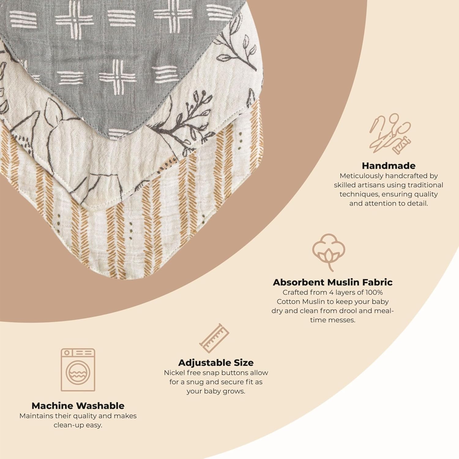 - CRAFTSMANSHIP: Reflecting India's rich textile heritage, our muslin bibs for baby boy showcase quality craftsmanship in every detail. These muslin bibs for baby girl also ensure compliance with fair trade practices, contributing to a more ethical consumer experience.