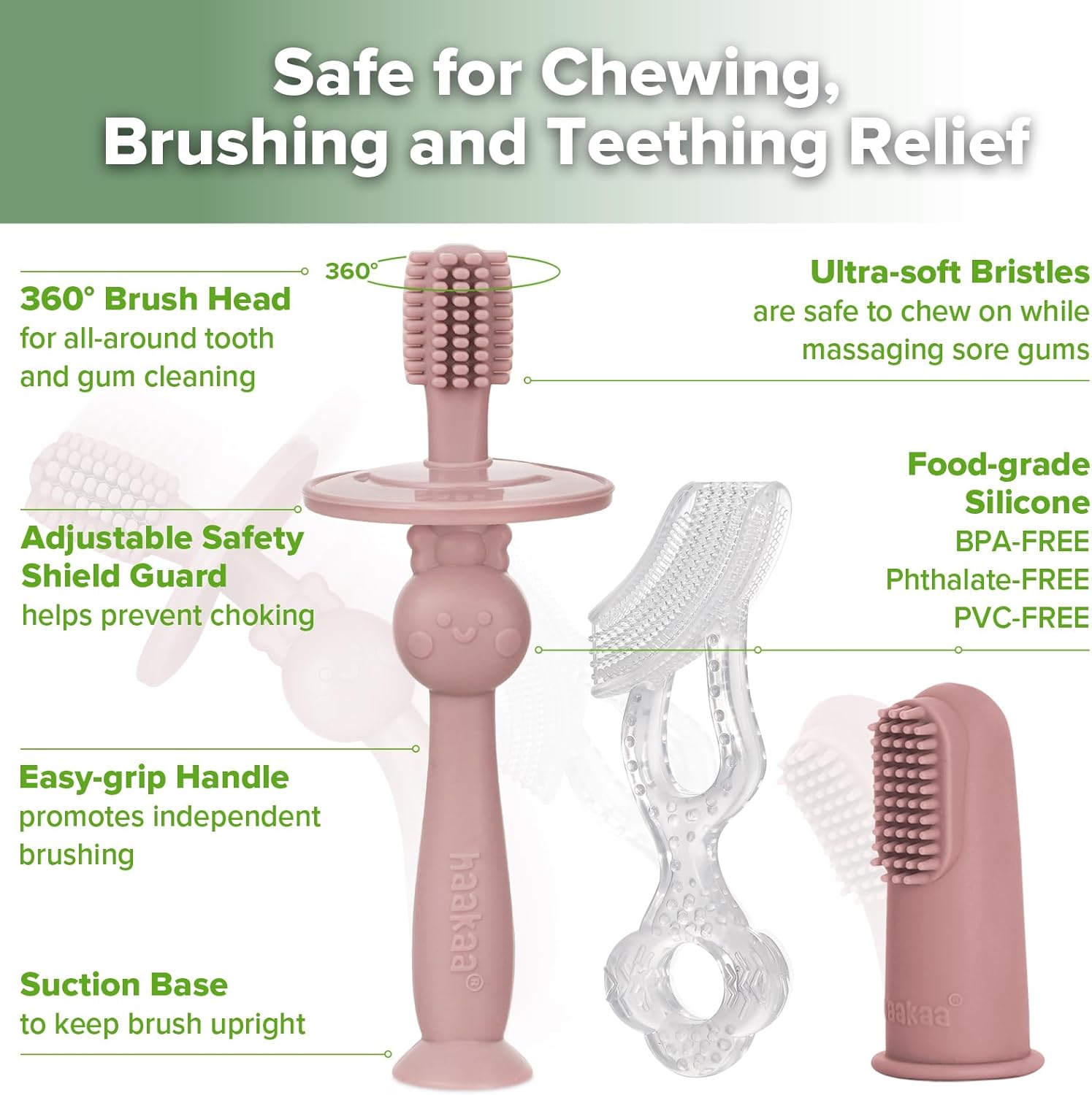 - ๐๐๐๐, ๐๐๐ง๐ญ๐ฅ๐, ๐๐ง๐ ๐๐ฎ๐ซ๐๐๐ฅ๐:Made from 100% food-grade silicone, the brushes are ultra-soft, flexible, and safe for daily chewing, brushing, and teething relief.