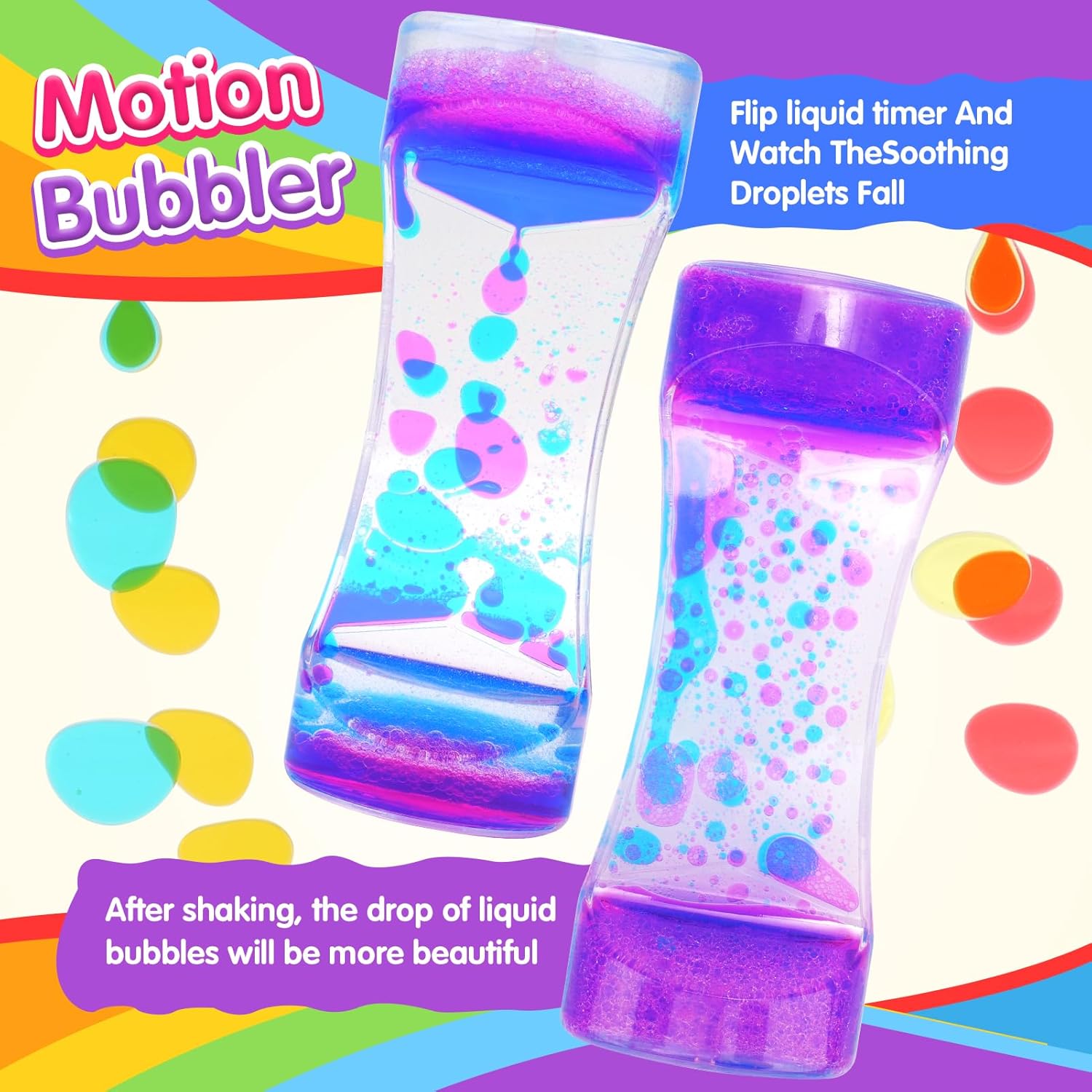 - 【Liquid Motion Bubbler Sensory Toys】The dual-color liquid droplets falling inside the liquid timer sensory toys have a soothing effect, and gravity will guide the dual-color liquid droplets to fall down, attracting children's attention. This sensory toy can help improve concentration, fidget toys enhancing children's learning in the classroom.
