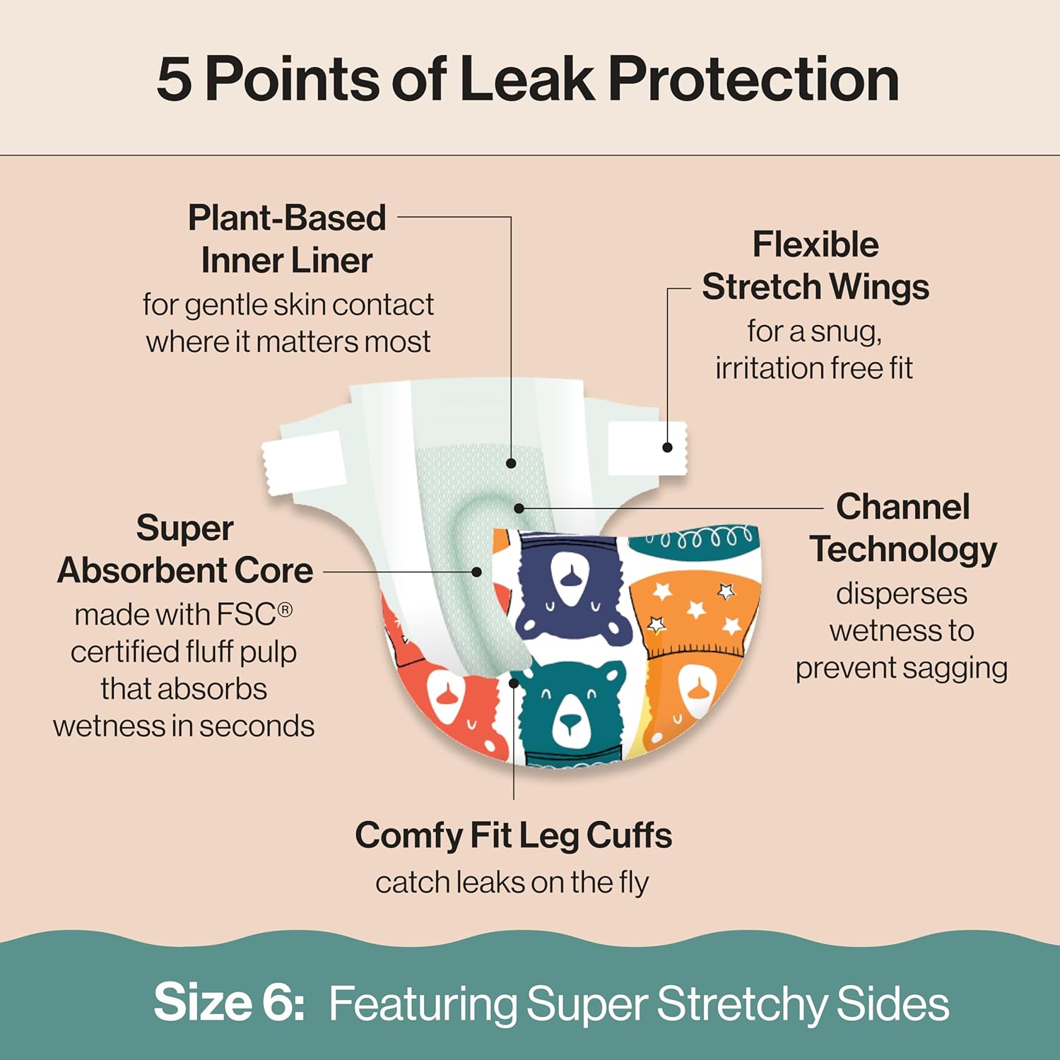 - OUR BEST FIT YET: Designed to move with your baby, Honest Clean Conscious Diapers feature comfy fit leg cuffs to catch leaks on the fly and flexible, stretchy wings that provide a snug, irritation-free fit. The super cute prints are an added bonus