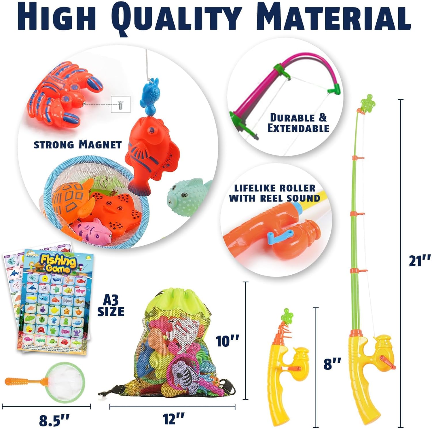 CozyBomB™ Magnetic Fishing Toys Game Set for Kids | Water Table Bathtub Kiddie Pool Party & Pole Rod Net, Plastic Floating Fish Toddler Color Ocean Sea Animals Birthday Age 3 4 5 6 Year