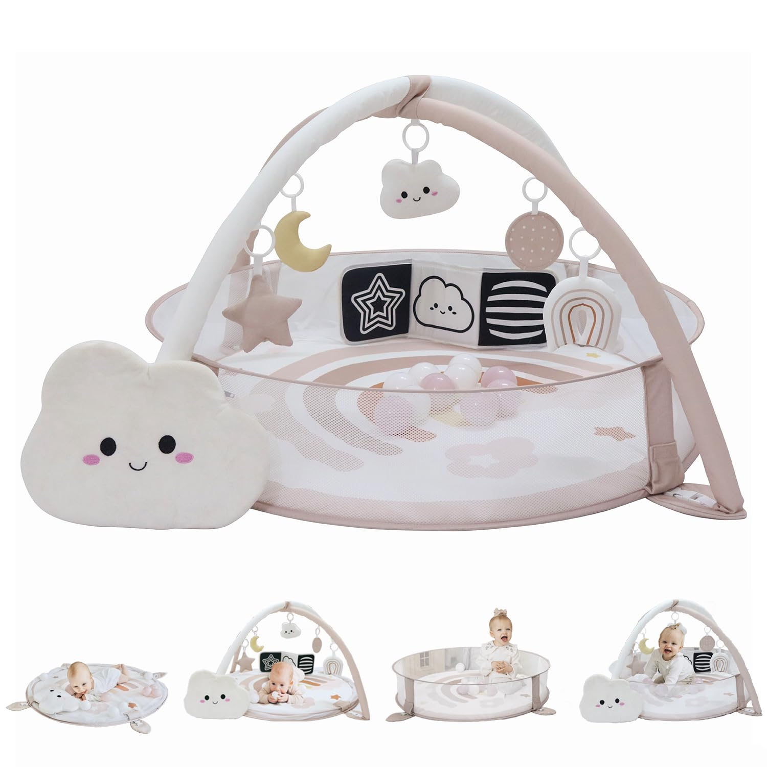 - š¼ {Adaptable} This versatile baby play mats for floor encompasses 6 different uses: tummy time mat, baby gym, pop up mesh fence, high contrast book, ball pit with 10 balls included and cloud storage bag. Engineered to align with your baby's developmental stages, this mat will capture your baby's attention providing hours of both entertainment and learning. Caution: Always ensure adult supervision during use.