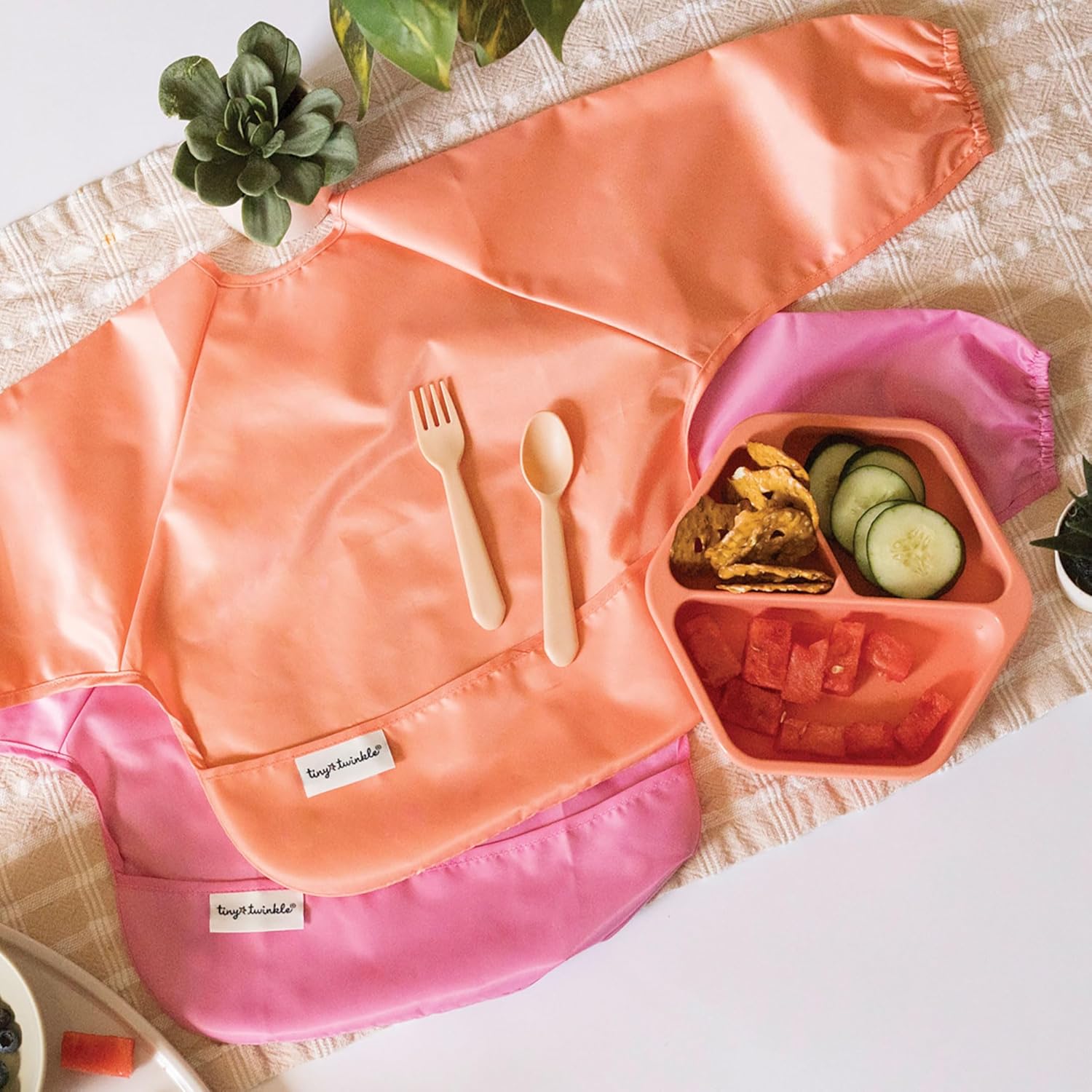 Tiny Twinkle Mess Proof Baby Bibs, 2pk Waterproof Smock Baby Bibs for Eating, Machine Washable Long Sleeve Bibs, Baby Led Weaning, Toddler Bibs, BLW Supplies (Sweet Treat, Small 6-24 Months)