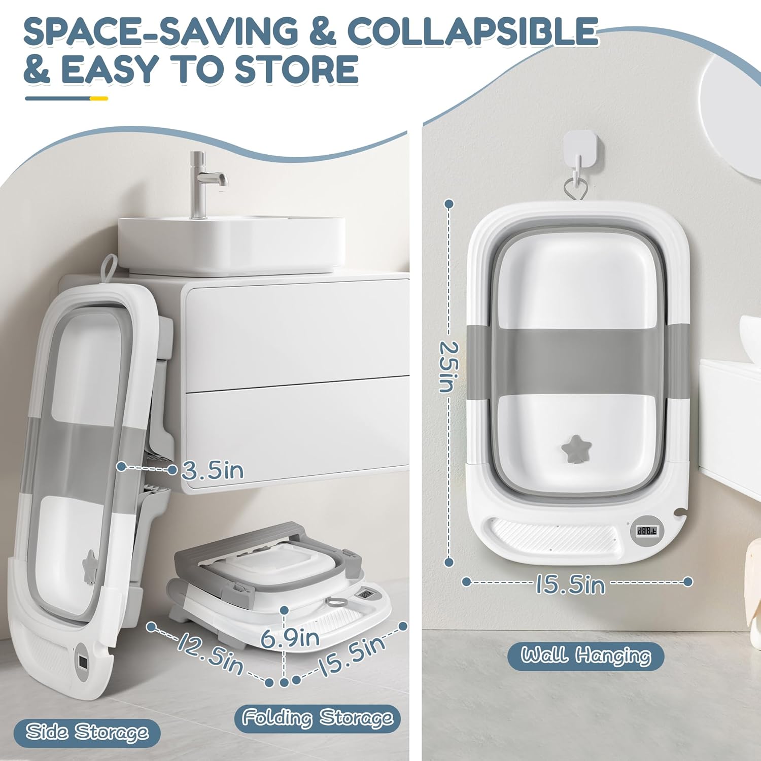- COLLAPSIBLE & SPACE-SAVING DESIGN: This baby bathtub easily folds into a compact square, with a thickness of less than 4 inches. Perfect for storage in the bathroom or car trunk, making it an ideal companion for home and travel.