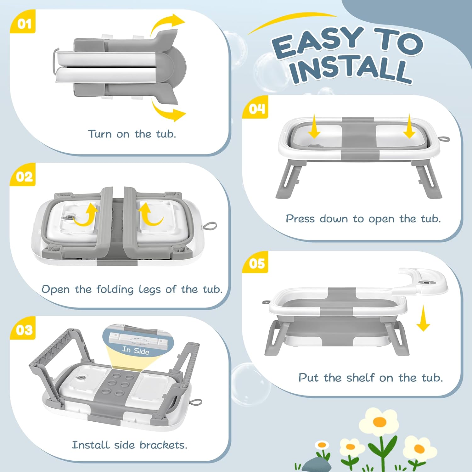 - SAFE MATERIAL:Crafted from high-quality PP+TPE materials, our baby bath tub prioritizes safety, durability, and peace of mind. Odorless and bite-resistant, it ensures no harm to your baby. The stable four-corner support design at the bottom enhances structural stability, minimizing rollover risks.