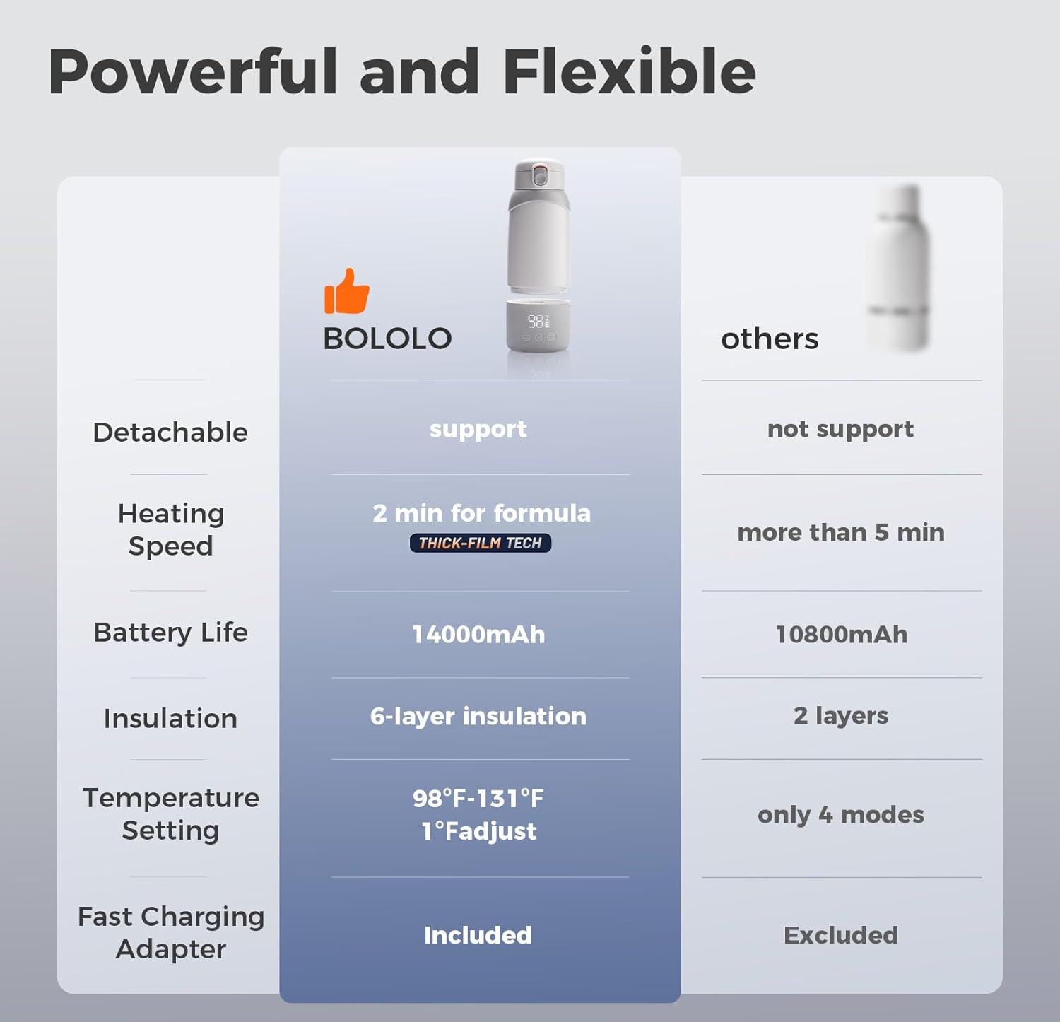 - Large Battery : Equipped with a 14,000mAh large battery and extended lifespan, it can heat 5 ounces of water to the specified temperature up to 16 times or heat the same volume of breastmilk up to 10 times on a single full charge, meeting your feeding needs throughout the day