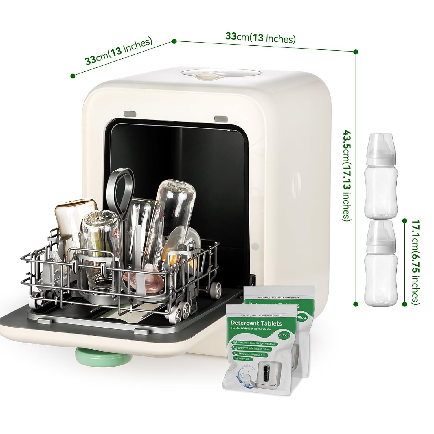 • Secure & Guaranteed: Each baby bottle washer comes with a 1-year warranty and includes 60 Universal across all brands bottle washer detergent tablets.